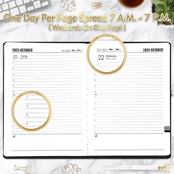 - ONE DAY A PAGE PLANNER: 12 months appointment planner. 1 DAY PER PAGE (2 days/page on Sat&Sun) spread from 7 a.m. - 7 p.m