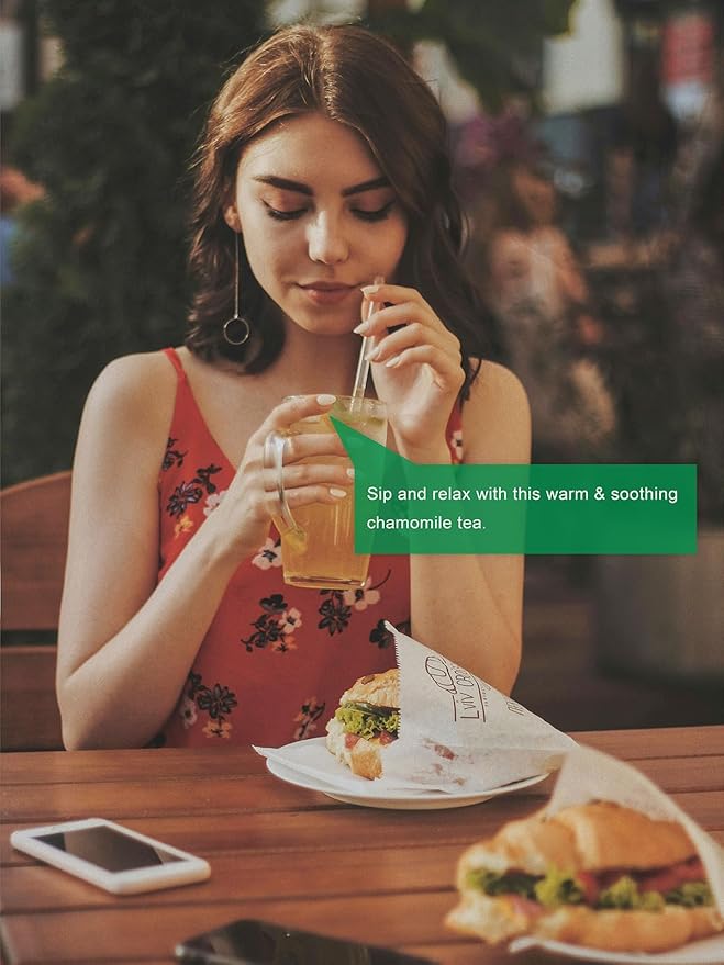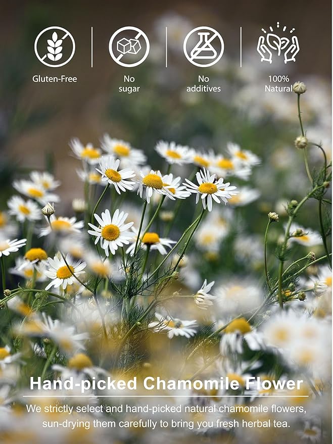 - [SOOTHING CHAMOLILE TEA] - A perfect warm & soothing tea to wind down at the end of the day. Chamomile tea is caffeine-free, you can savor the smooth and flavorful tea all day, enjoy it plain, or add honey, lemon, or other flavorings according to your preferences.