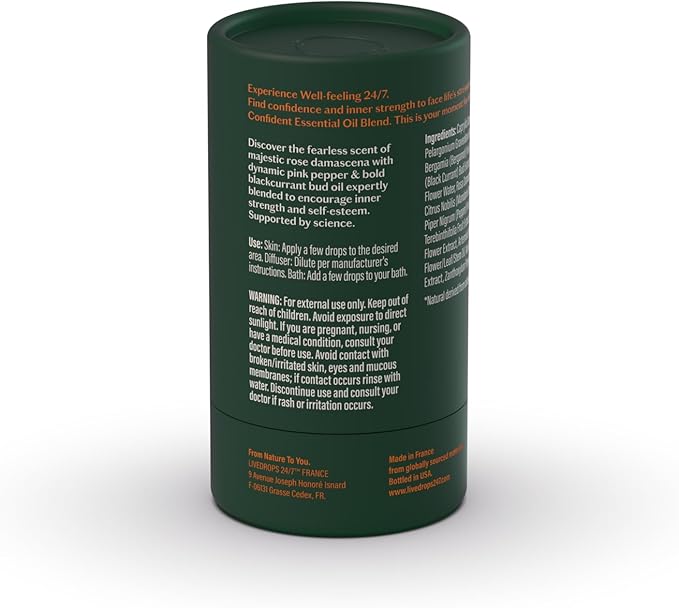 - Supported by Science and Quality Standards - Livedrops 24/7 unites natural perfumery with scientific research into the emotional impact of scent. Each bottle undergoes rigorous quality checks from sourcing to bottling, ensuring purity and consistency. With its balance of rose, pink pepper, and blackcurrant bud, the Confident Blend offers more than fragrance - it is a ritual of empowerment, positivity, and self-assurance.