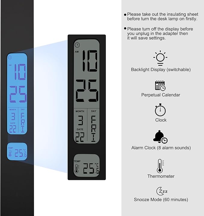 - 【Smart Display】The reading lamps for bedside table features 2 smart LED displays capable of showing time, calendar, alarm with 8 ring tones, and temperature. Various parameters can be easily adjusted using the large buttons on the back of the desk lamp. Simply touch th button to toggle the LCD screen light on/off. Additionally, for added convenience, the lamp with alarm clock includes a DIY snooze function, allowing you to set the snooze time from 1 to 60 minutes. Equipped with a button cell battery, the display screen ensures uninterrupted operation even during power outages. Moreover, it has a memory function, preserving the time settings when the lamp for desk restarts after a power loss.