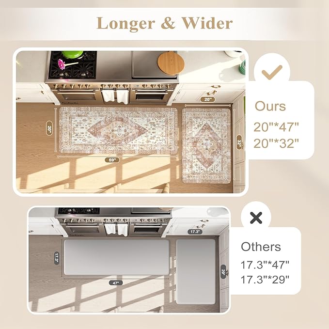 - Wider & Longer Kitchen Rugs 2PC: The set contains 2 rectangular kitchen mats measure 20"x47"+20"x32" which are wider than ordinary kitchen mats on the market.The comfort standing mat are made of high-quality and premium PVC materials,to ensure that the mats will keep their shape, even with extended and long-term heavy duty use.