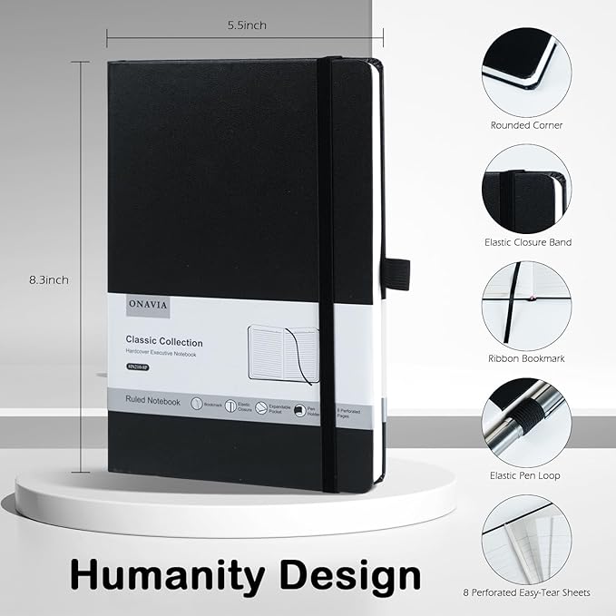 - 【Humanity Detail Design】ONAVIA A5 Journal Notepad includes 1 Ribbon Bookmark that can help you mark the exact spot you left off. 1 Elastic Pen Loop ensures that you always have a pen or pencil readily available when you need to jot down a note. 1 Expandable inner pocket for storing loose items like notes, bills, receipts, appointment cards, and more