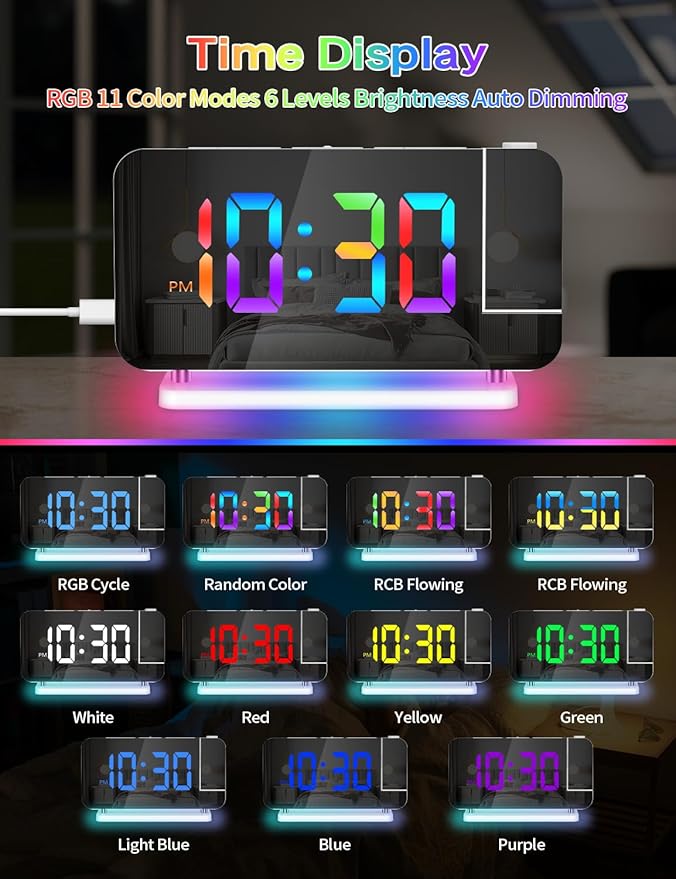 - VERSATILE LIGHTING AND DISPLAY--【A】10-Color Night Light: Built-in atmosphere light with 3 dynamic RGB colors and 7 fixed color modes, plus 5 brightness levels for bedroom ambiance.【B】11-Color RGB Digital Display: Color-changing LED display with 4 dynamic RGB colors and 7 fixed modes, along with 6 brightness levels and auto dimmer for a customized visual experience.