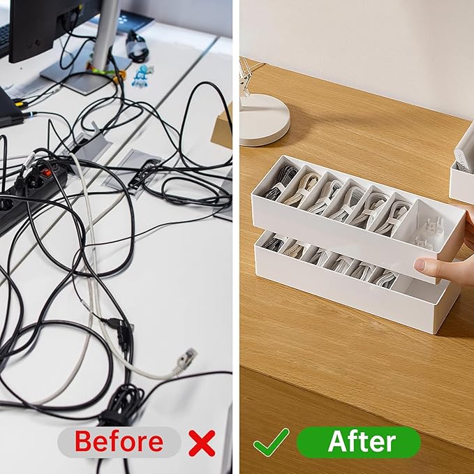 - 【Detachable Design】The partitions of cord storage organizer box are detachable, you can adjust the size and space of the compartment according to your needs, enlarged compartments allow you to easily store chargers, headphone cases and more. Practical and visual design assists you in organizing your space well, storage and organizing are flexible and convenient, no more messy wires and cables on your desk.