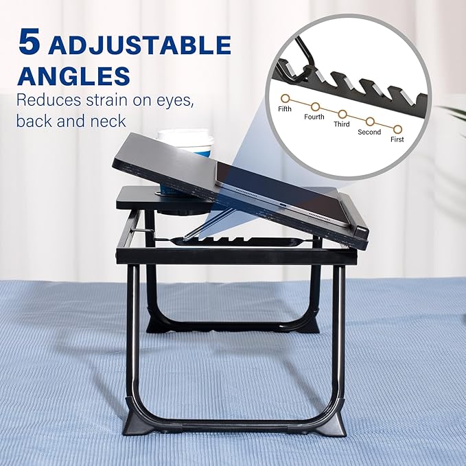 Laptop Desk for Bed Couch, Adjustable Foldable Bed Table with Cup Holder, Breakfast Serving Tray, Portable Laptop Lap Desk Stand for Working Reading Writing Eating Gaming in Bed Sofa Floor(Black)