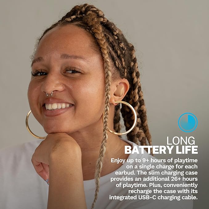 - Battery Life: Listen for the long battery life with your wireless earphones; stay for the comfort. Go Air Tones+ features 9+ hours of playtime in each earbud and 26+ extra hours from the charging case. Thatβs 35+ hours of playtime with your bluetooth earphones.