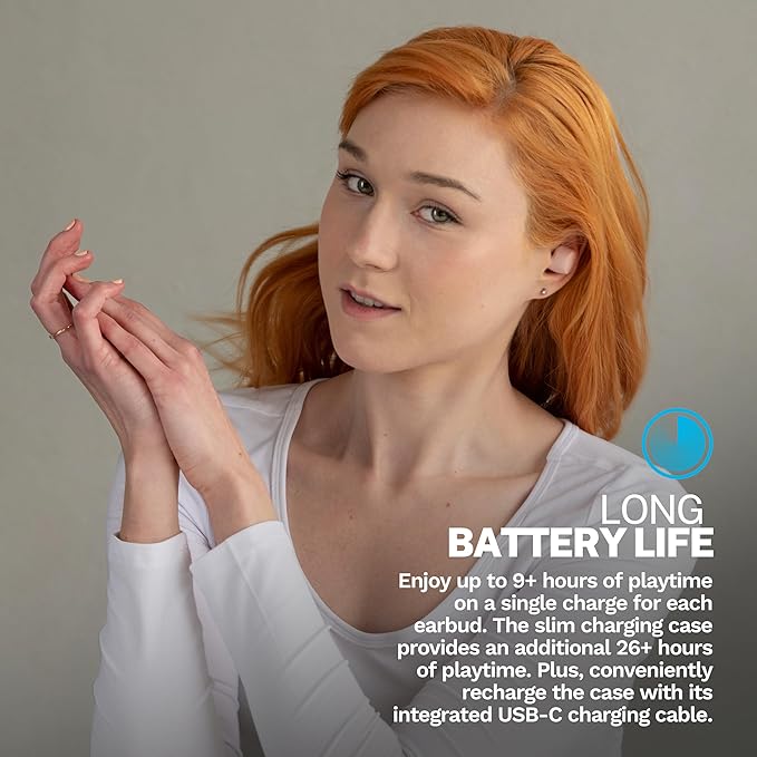 - Battery Life: Listen for the long battery life with your wireless earphones; stay for the comfort. Go Air Tones+ features 9+ hours of playtime in each earbud and 26+ extra hours from the charging case. Thatβs 35+ hours of playtime with your bluetooth earphones.