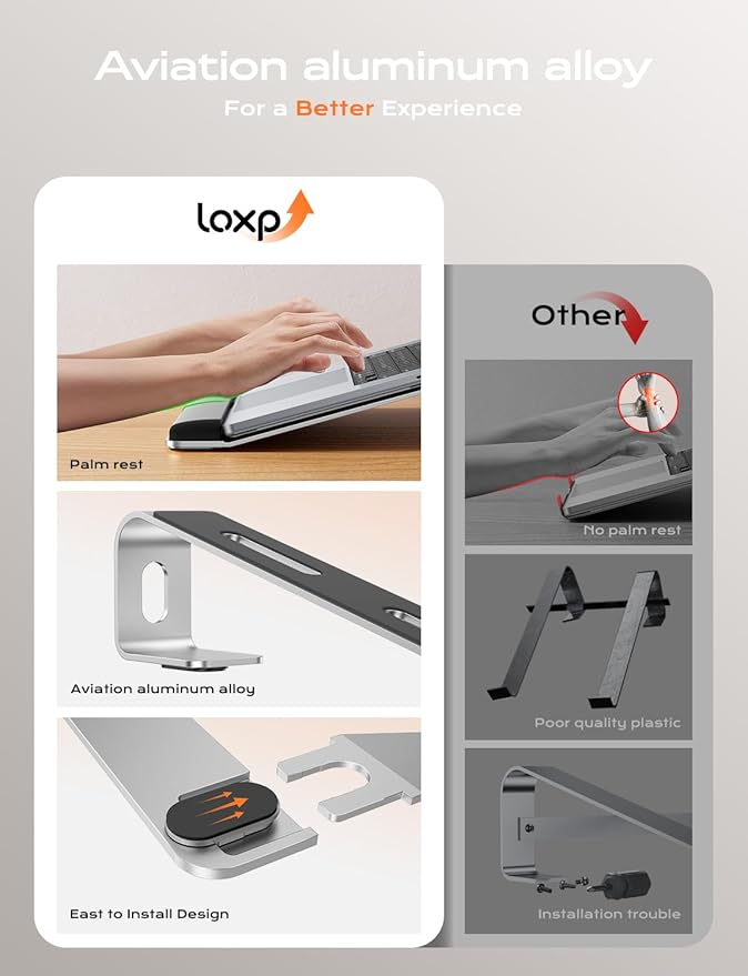 - 【Solid and Sturdy Metal Stand】This laptop wrist support is designed by engineers of loxp based on the concept of triangle stability. Three different force points provide strong support for your laptop device. All three sides are made of durable and tight aluminum alloy material. It is detachable and does not require screws. It is easy to assemble and disassemble. You can use it as a travel laptop stand because it is easy to carry.