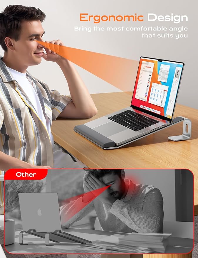 - 【The Strongest Ventilation and Heat Dissipation Effect】The open frame design of the Macbook stand for desk has the largest air circulation area - up to 90% airflow. And the use of high-quality aluminum alloy materials increases the heat dissipation effect, allowing your computer to always stay cool, using a laptop riser for desk can slow down and extend the life of your laptop.