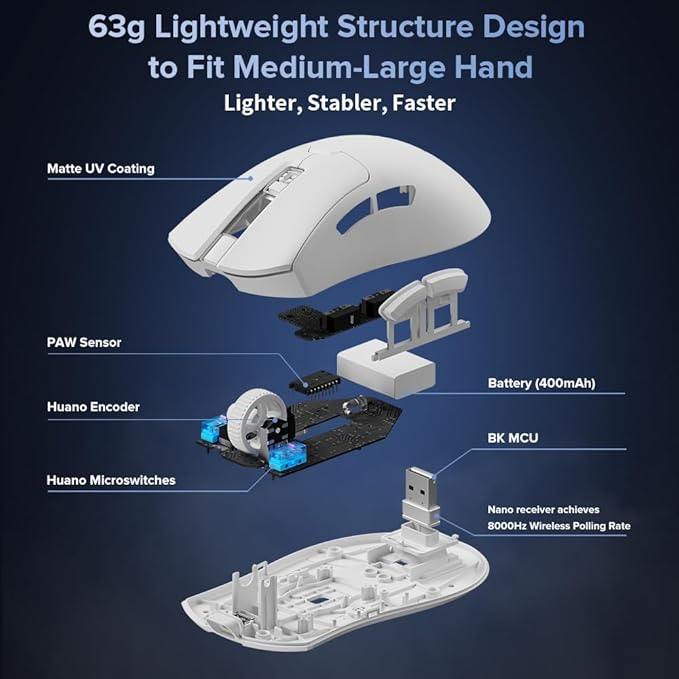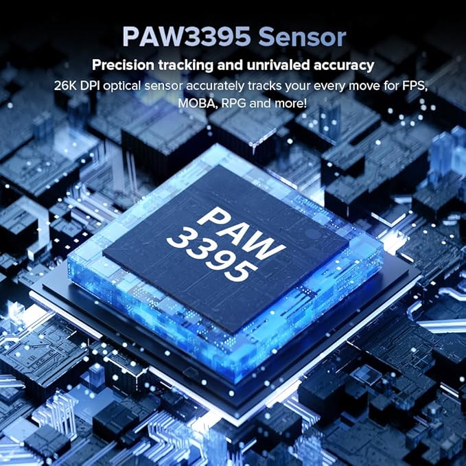 - PAW3395 Sensor: Up to 26000 DPI provides high precision and accuracy to accurate tracking of the mouse movements