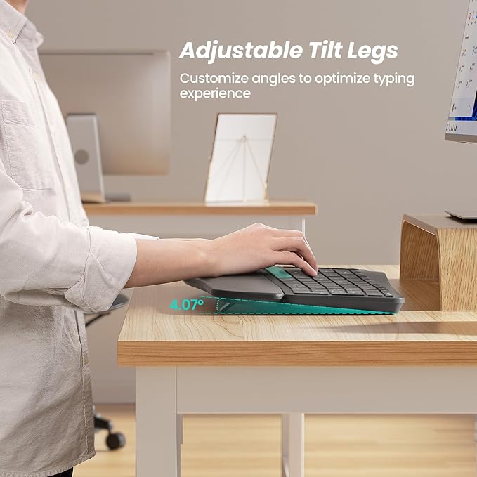 - Enhanced Wrist Comfort: Our keyboard includes a curved palm rest with a soft memory foam layer, offering superior wrist support and reducing wrist bending. Meanwhile, the adjustable tilt design allows for optimal positioning, ensuring your wrist remains relaxed and comfortable, whether you're seated or standing.