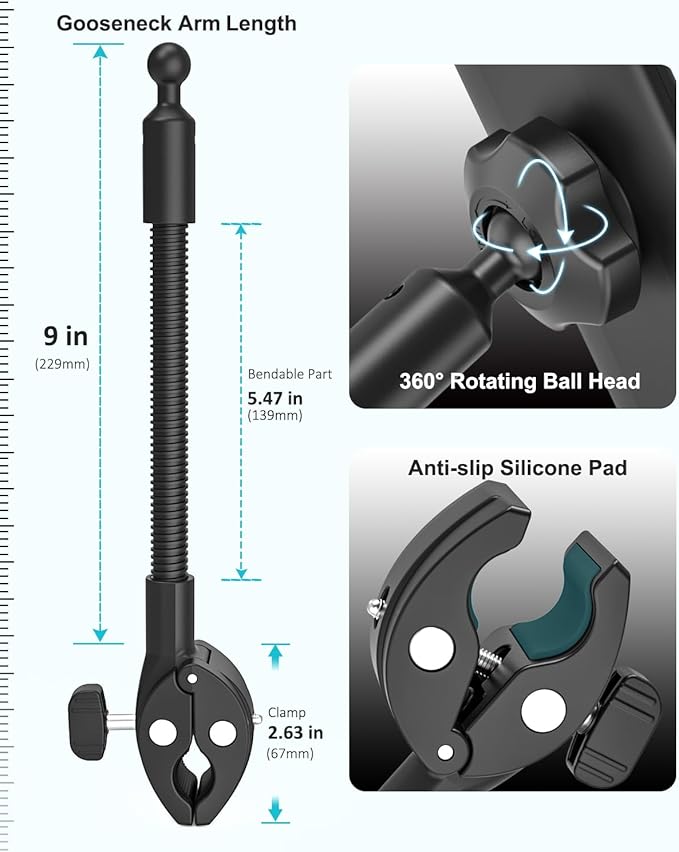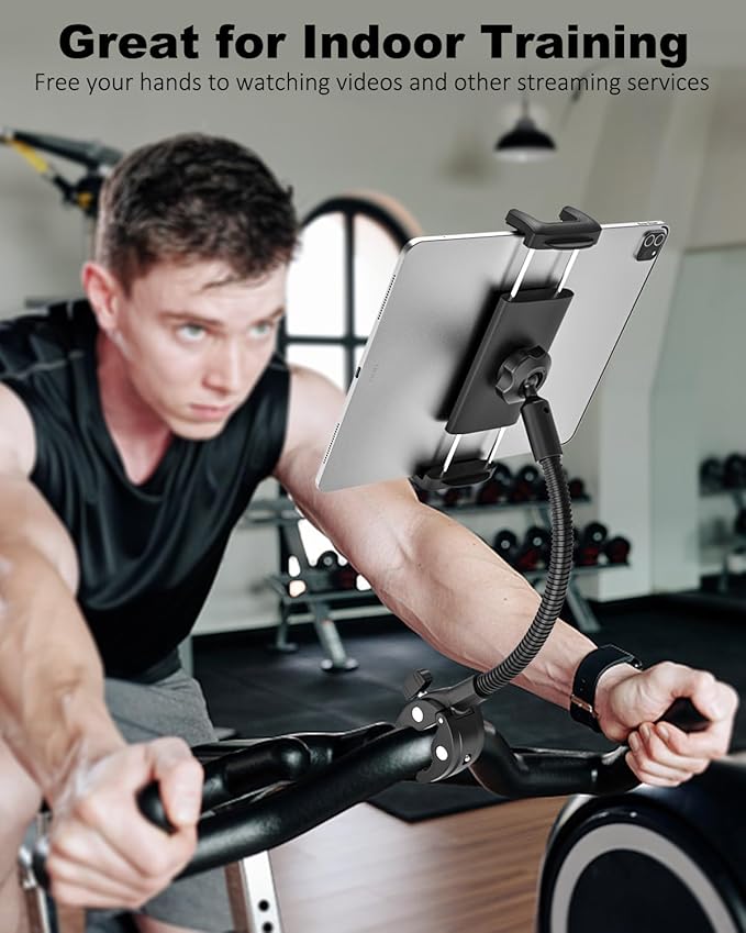 - 【Stable Clamp Mount】Exercise Bike Tablet holder (diameter size: 0.51-1.61") frees your hands during exercise and is ideal for watching fitness instruction videos or recording your fitness process. This gooseneck tablet clamp is not only suitable for exercise bike, spin bike, elliptical, treadmill, Elliptical, Stationary Bicycle, Peloton, wheelchair, stroller, golf cart, etc. but also fits any handlebar, tube, pole, etc.