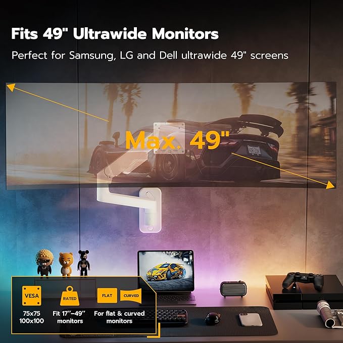 - 【Tailored for Ultrawide Monitors】The ARES WING computer monitor wall mount is designed with a superior tilt structure that can comfortably support ultra-wide monitors up to 49 inches, including 1000R curved monitors. Its impressive weight capacity of 44 lbs can securely accommodate your 17"-49" monitors on the wall. If your monitor does not have a VESA hole, you need to prepare a VESA mount adapter.