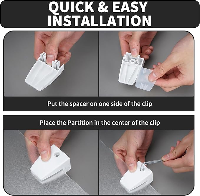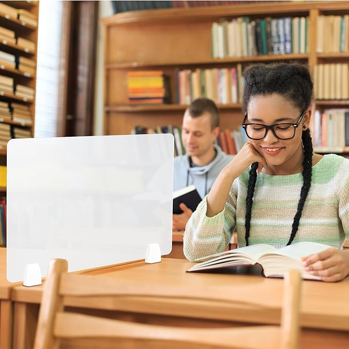 - VISUAL & SPATIAL PRIVACY: Protective shield barrier set size:24"Lx 16 "H. Frosted acrylic divider is 0.2" thick with 8 clips for fastening.Office partitions provide a barrier to the space to keep people away from sneezes and are perfect for dividing open work areas. Allows you to enjoy your own space while working with others without interruptions!