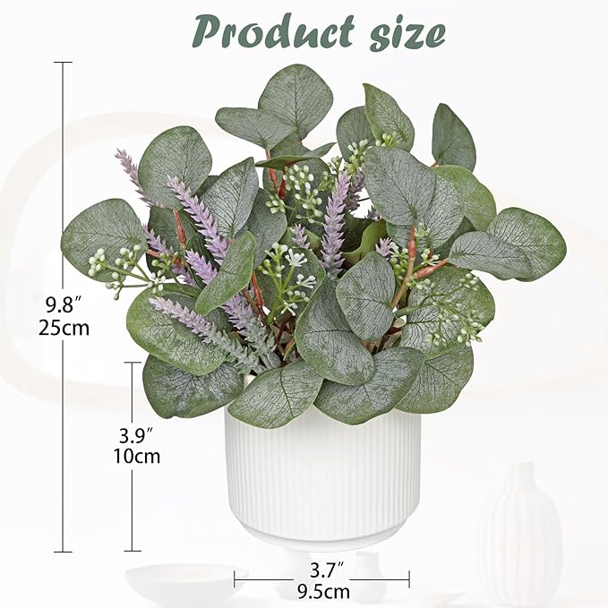 - The Gift That Keeps Giving - Faux plants indoor tabletop are 9.8" tall, while the white ceramic pots measure 3.9" tall and 3.7" wide. Our fake eucalyptus plants are more than just home decor, because the small artificial plants indoor bring heartfelt meaning - a housewarming gift that never dies, a birthday present that keeps giving, or a self-care treat saying "you deserve beautiful things". Any problem with these fake potted plants, please let us know.