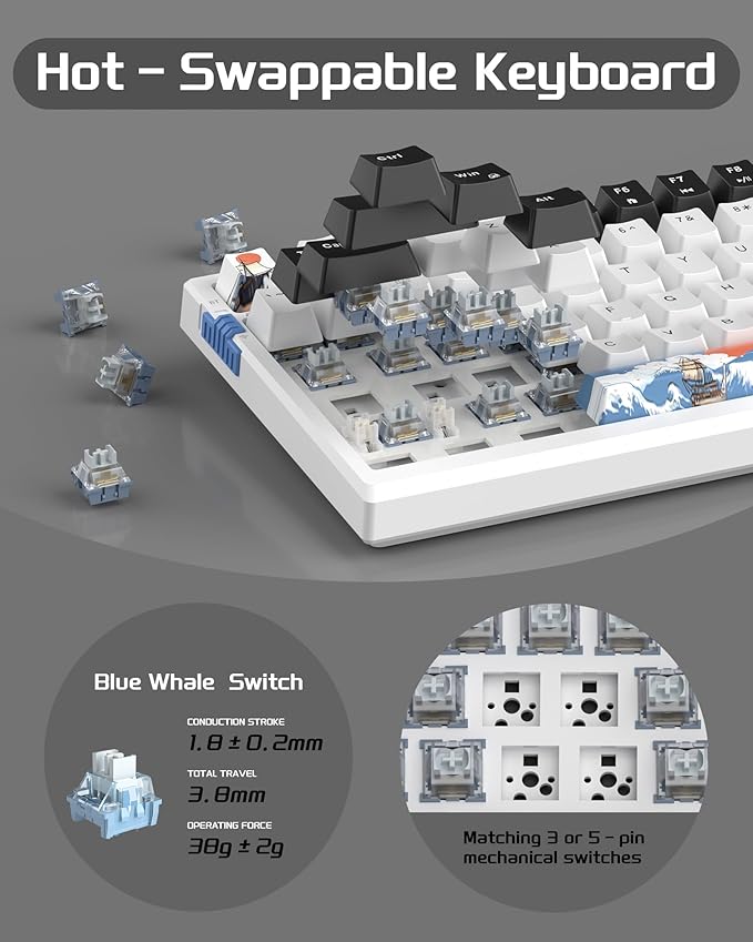 - HOT-SWAPPABLE SOCKET & PRE-LUBED CUSTOM SWITCHES: This 96% mechanical keyboard is compatible with 3-pin or 5-pin switches, allowing you to personalize your keyboard. The switches are individually removable and can be replaced in seconds. The SKY98 keyboard utilizes MageGee's finely tuned switches, which are pre-lubricated at the factory and built to last up to 70 million keystrokes for responsive and creamy typing.