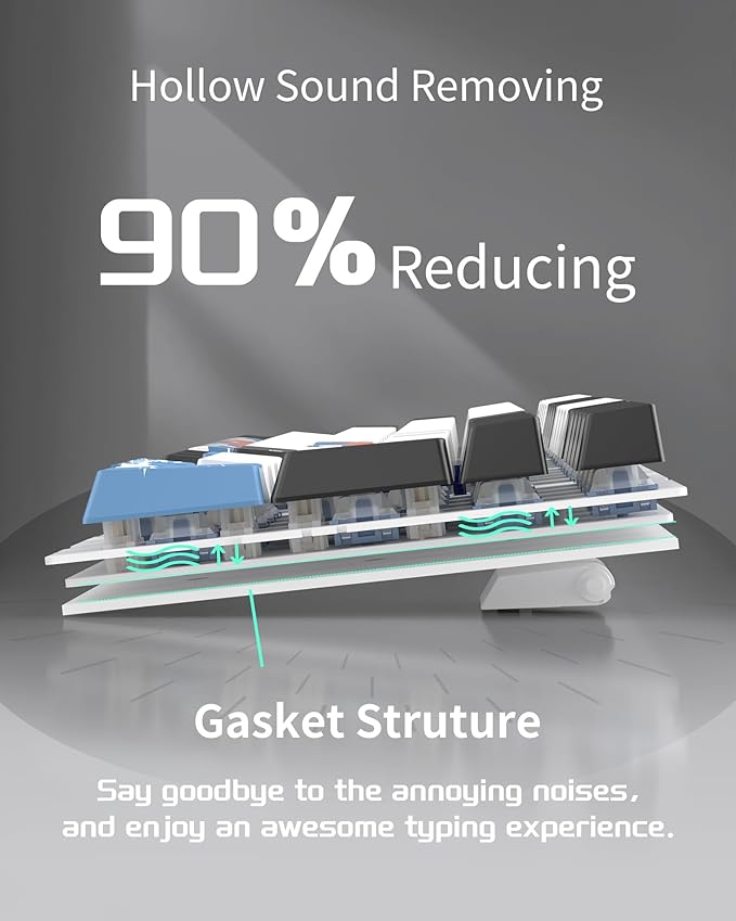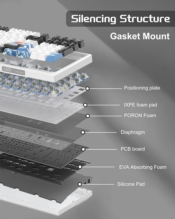 - 5-LAYER SOUND ABSORBING FILLING: In order to improve the noise situation, this wireless gasket keyboard is equipped with a IXPE foam pad, PORON foam, diaphragm, EVA soundproofing foam and silicone absorbing pad in the gaps between the positioning plate, PCB board and bottom. This greatly reduces the resonance space inside the keyboard, thereby suppressing hollow sounds and making every key press comfortable and pleasant. For gamers and office users, this keyboard is a great addition to the desktop.