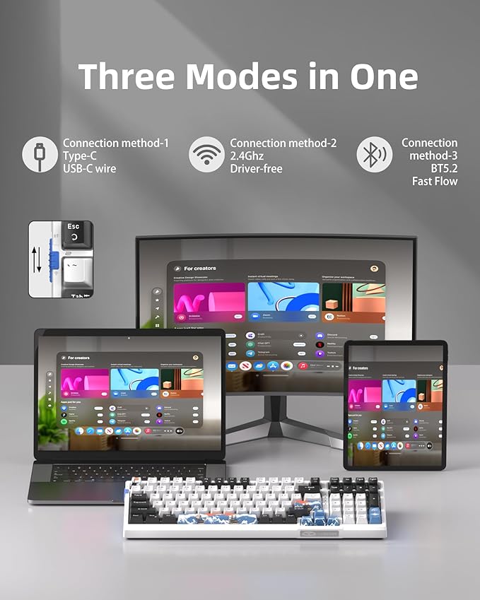 - TRI-MODE CONNECTIVITY & 3000MAH BATTERY: SKY98 96% gaming keyboard supports 3 connection modes: stable wired, ultra-sensitive BT5.0 and hassle-free wireless 2.4G, allowing up to 5 devices to be connected at the same time. The toggle switch on the side of the keyboard can switch the connection mode for easy and quick response. SKY98 has a built-in 3000 mAh battery, which can last for about 16 hours when used with the light on. You can check the battery level at any time by pressing FN + Backspace.