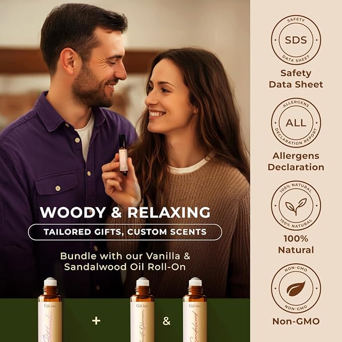 Gya Labs Patchouli Roll On, Luxurious Aroma for Confidence and Allure - Patchouli Essential Oil Roll On for Tranquillity and Inner Peace - 0.34 Fl Oz - Travel-Sized Convenience and Quick Absorption