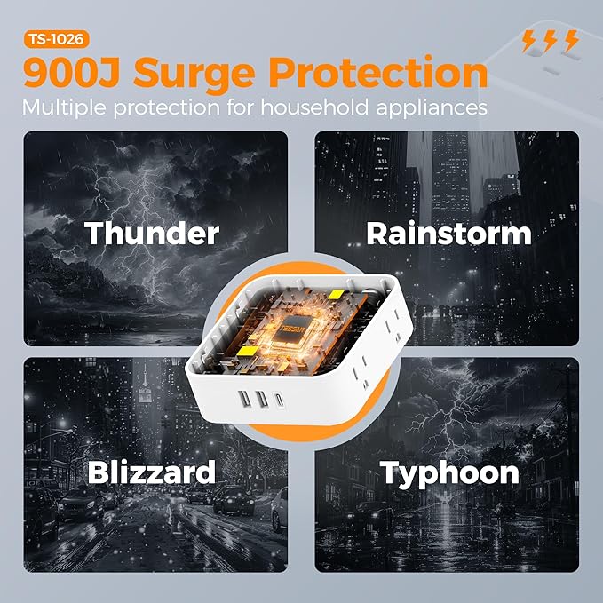 - 900J TESSAN Surge Protector Outlet: Equipped with overload protection, short-circuit protection, over-current protection, and etc; Reliable on/ off switch can automatically shut off and protect your expensive electronics, providing you with a safe and reliable charging environment