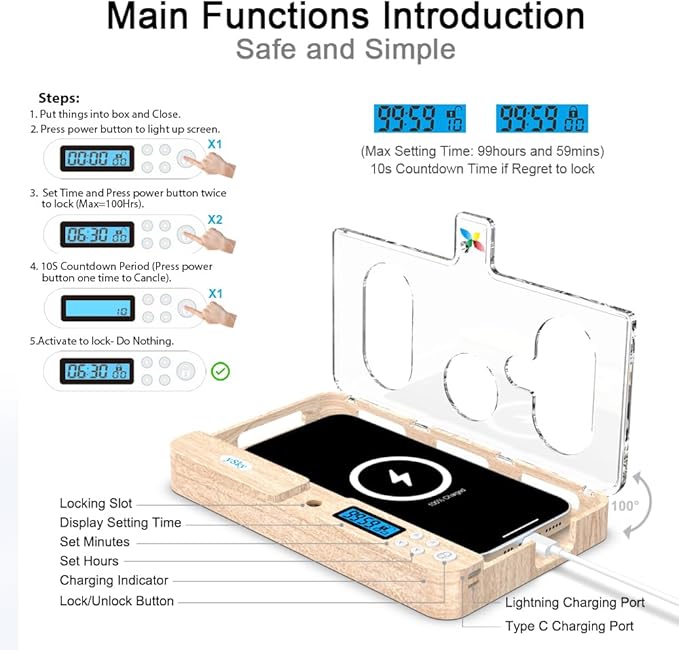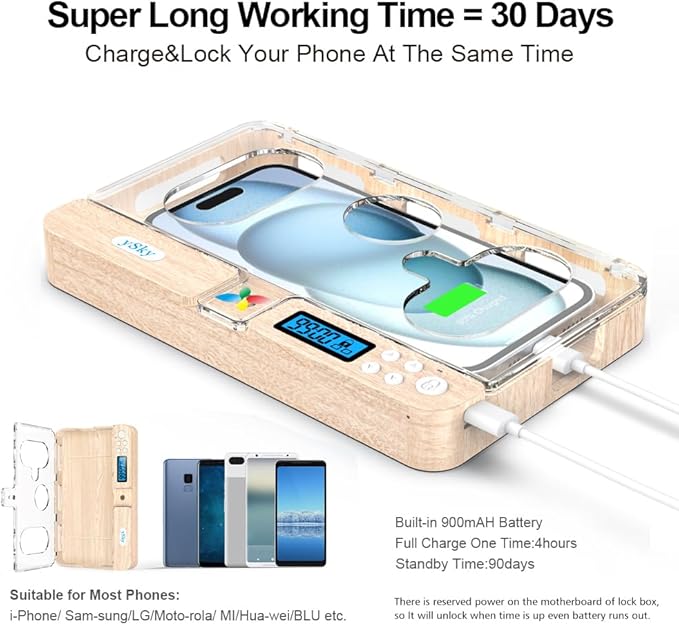 - 【30 days long working Time with Auto-Timer】: Max working Time Reach Up 30Days Once Full Charge. Max setting Time is 99hrs and 59mins ,Super standby time over 90 days.Phone jail box with timer can make you reduce screen time, focus on work, study and life, effectively multiply your time.