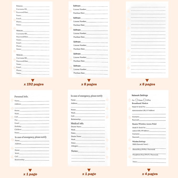 - User-Friendly Layouts: Designed to cater to all your internet needs, our password notebook allows to store up to 576 passwords, along with 48 records of licenses, and essential network, email, and wireless settings. It comes with extra lined pages for taking notes, using them for keeping track of security questions, hints, or any other relevant details. Stay organized and never miss an important detail again!