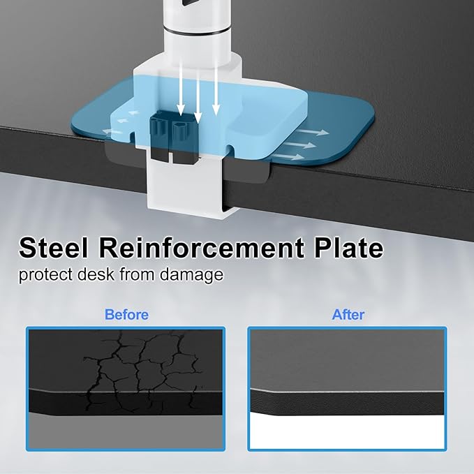 - Protects & Organizes:All-steel reinforcement plate kit safely evenly distributes monitor weight, prevent distortion of the mounting part and protect your desk from damages and scratches. Included cable clips delivery maximum tidiness, even the Allen key can be tidied away under the cover so that you always have it ready.