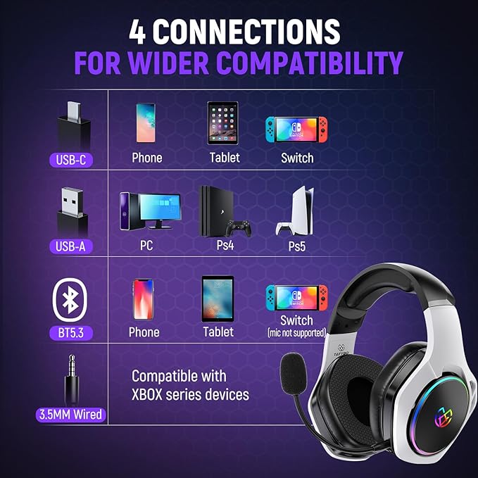 - ⚡ New Technology, New Experience:The widest compatibility than any other gaming headsets: Bluetooth & 2.4GHz wireless tech, Both USB & Type C connector,which means suit for almost all gaming devices expect XBOX. When bluetooth for phone, 2.4GHz for game, we can freely call when gaming.