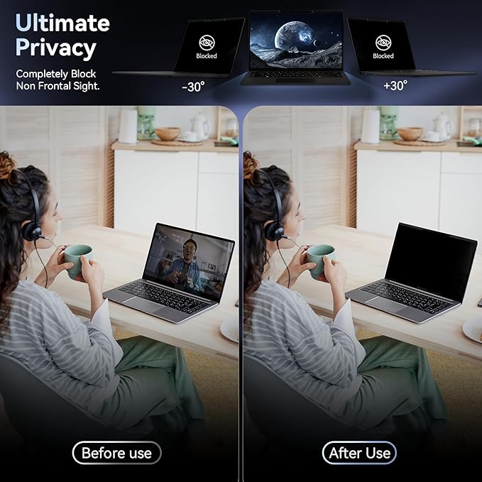 - 【Improved Privacy Filter】Protescreen 14 inch privacy screen filter after 200 times updates,Use revolutionary micro-louver technology. The 14 inch laptop privacy filter limits viewing angle to +/- 30° and provide clear vision on the front. If see from the sides, the greater the angle the darker the screen.Anyone who tries to peek over the side will only see a dark screen! So with a laptop privacy screen protector 14 inch, the privacy of your laptop screen will never be leaked.