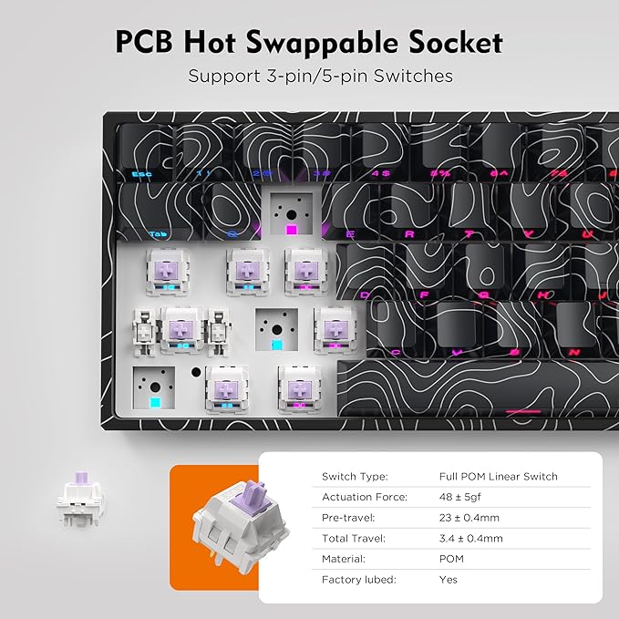 - 【Hot-swappable Custom Creamy Keyboard】This customizable keyboard with hot-swap PCB allows users to replace 3 pins/5 pins switches easily without soldering issue. M61 PRO compact keyboards equipped with pre-lubed linear switches and customized stabilizer, bring smooth typing feeling and pleasant typing sound, provide fast response for exciting game.(keycap/switch puller are included in the package).