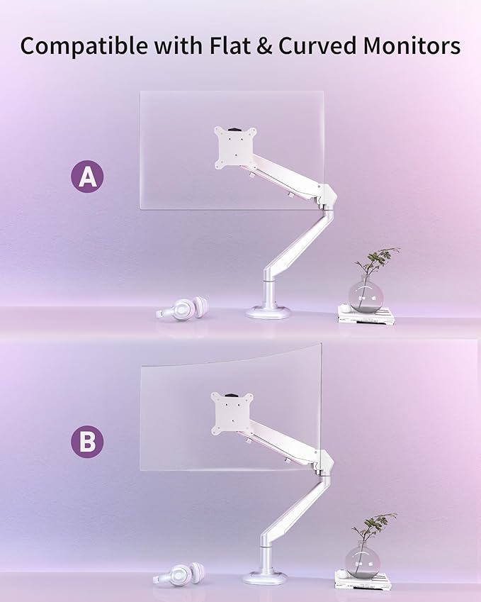- 【Universal Compatibility】 G5 white monitor arm can fit most screens (even gaming monitors) up to 32 inches within 19.8 lbs, and is compatible with 100 x 100 mm and 75 x 75 mm VESA patterns.
