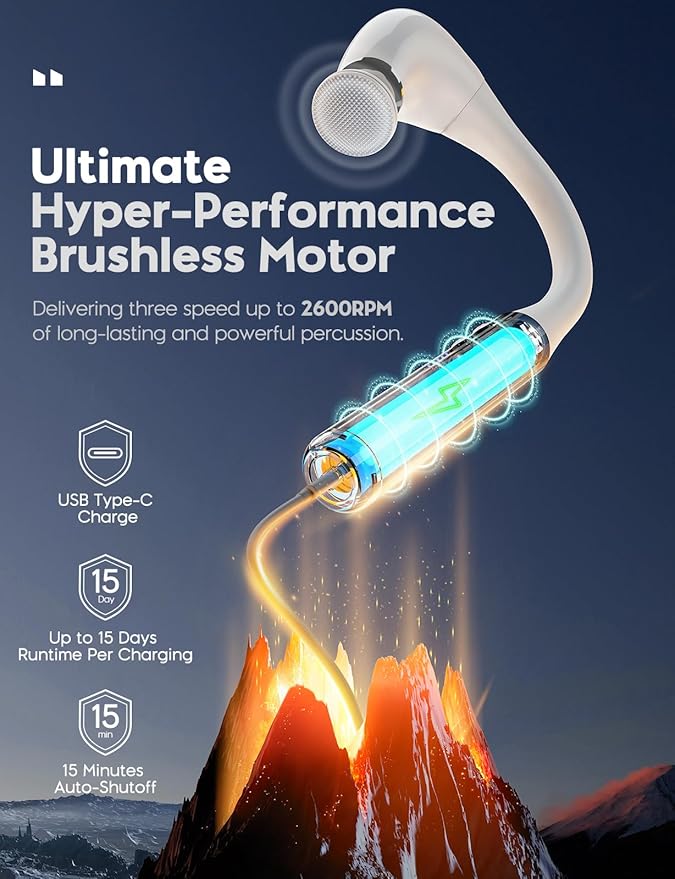 - Powerful Brushless Motor and Ultra-Quiet Technology.The white massage gun is equipped with a powerful brushless motor that lasts up to 200 hours. Combined with ultra-quiet technology, it gives you a quiet, relaxing massage experience at less than 45 decibels. Even if you're on the phone or watching a programme, you won't be disturbed