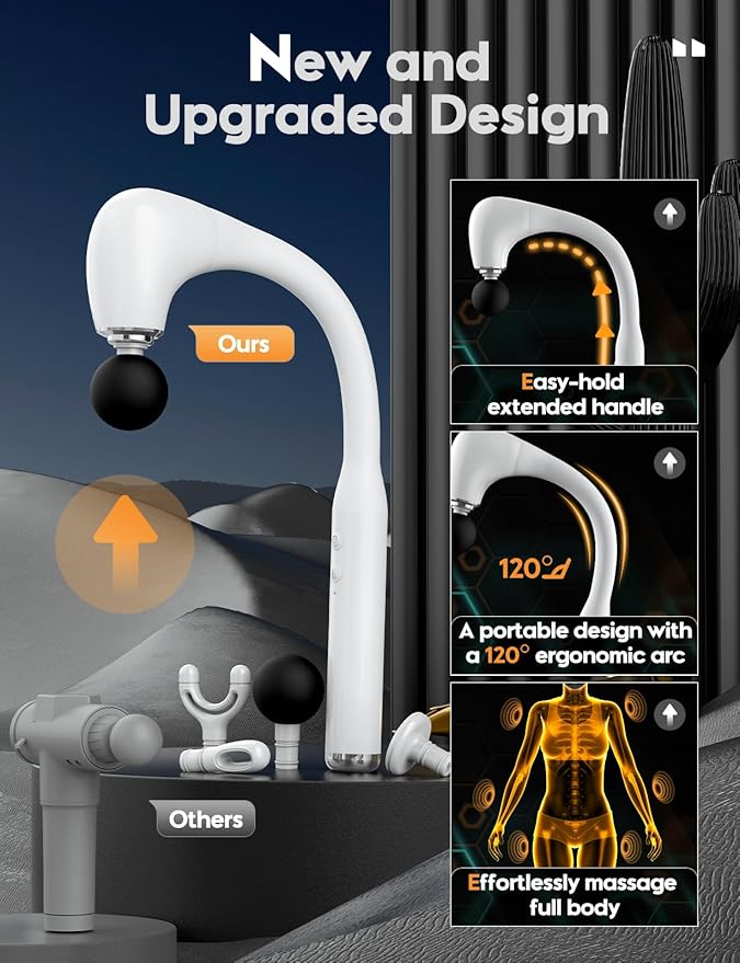 - Comfortable Handle Extension and Ergonomic Design. The massage hammer features an easy-to-grip extended handle and an ergonomic 120° curved design that seamlessly conforms to the physiological curvature of the human spine. Unlike ordinary massage guns, our Deep Tissue Massage Gun with flexible arms makes it easy to relax your back/neck/shoulders/waist/legs/arms and other hard-to-reach areas without help. It is a massage tool for pain relief and accelerated recovery from sports injuries