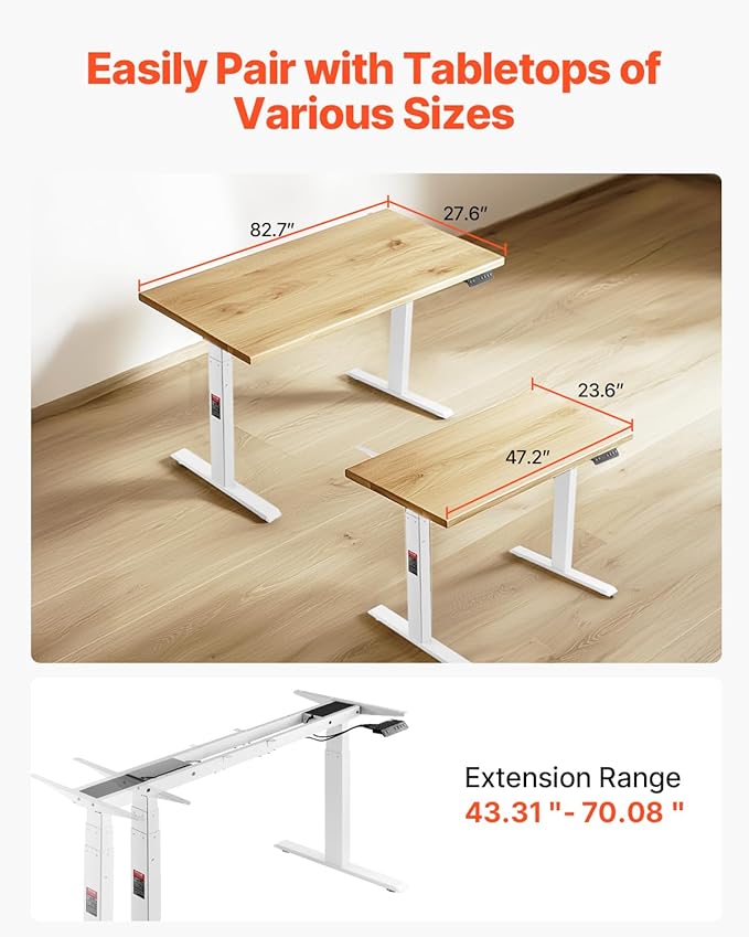 VEVOR Dual Motor 3 Stage Standing Desk Frame, Adjustable 26"-50.8" Height & 43.3"-70.1" Length Electric Stand Up Computer Desk Legs, Ergonomic DIY Workstation Base for Home Office(Frame Only)