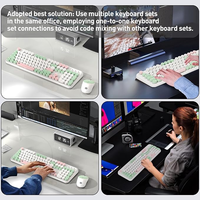 - Colorful Keyboard Shared Receiver : A USB receiver simultaneously drives the keyboard and mouse, enabling wireless transmission with a stable and delay-free signal,2.4G wireless transmission technology, supporting multiple computer types.The design incorporates splash resistance, with a waterproof conductive film that allows liquid to flow out from within the keyboard membrane. The mouse requires one 1.5V AA battery (included), while the keyboard requires two 1.5V AAA battery (included).