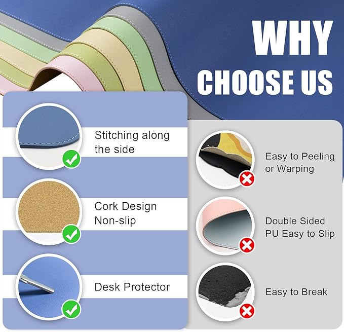 - Superior Protection Mat for Desk: Durable PU leather and cork material, provide reliable protection for your desk surface. Safeguard your tabletop from everyday wear and tear with our Dual-Sided Desk Pad. This large mouse pad and desk mat combo is a protective barrier, preventing scratches, scuffs, and spills from damaging your workspace.