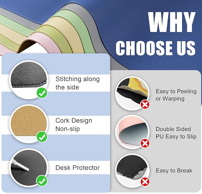 - Superior Protection Mat for Desk: Durable PU leather and cork material, provide reliable protection for your desk surface. Safeguard your tabletop from everyday wear and tear with our Dual-Sided Desk Pad. This large mouse pad and desk mat combo is a protective barrier, preventing scratches, scuffs, and spills from damaging your workspace.