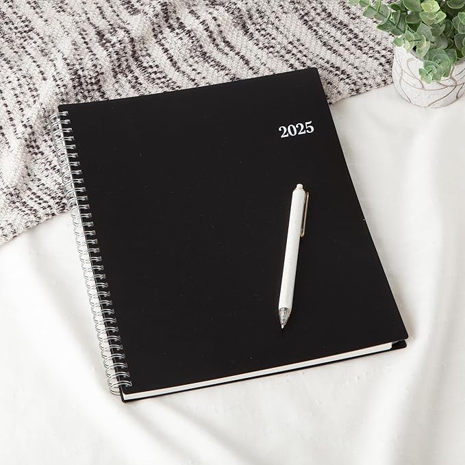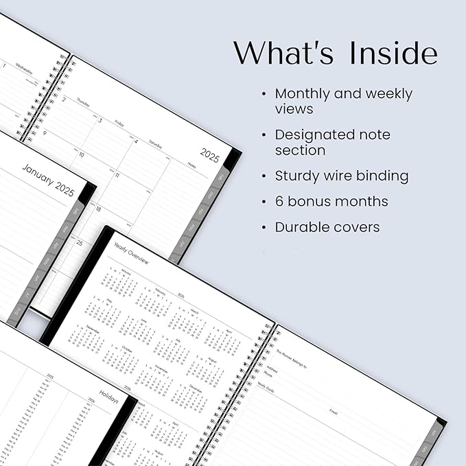 - January 2025 - December 2025 stylish day planner with 12 months of monthly and weekly pages for easy year-round planning; 6 additional monthly pages (July 2024 - December 2024) are included