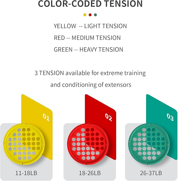 - Adjustable Resistance on the Go - Easily modify the resistance by adjusting your hand position or finger depth in the cutout holes. Choose from Three color-coded resistance levels, ranging from light (Yellow) to x-heavy (Green), and one size: 7" diameter. The resistance finger webs cater to various strength-building needs.