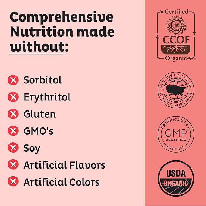 - Organic certified and third party tested: USDA Organic Certified by CCOF, made in a GMP certified facility. No artifical sweeteners, artificial flavors or preservatives, Non-GMO, Vegan, made without gluten, dairy or soy, keto friendly