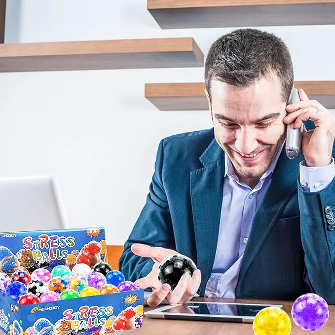 - đ€ăStress ReliefăRelieve stress, and tension just by simply squeezing, squishing, and stretching these bead balls. These squishy ball fidget can give your wrist a good workout and definitely help distract you from stress without distracting you from working. Also a great calming tool for adults with autism, ADD, and ADHD.