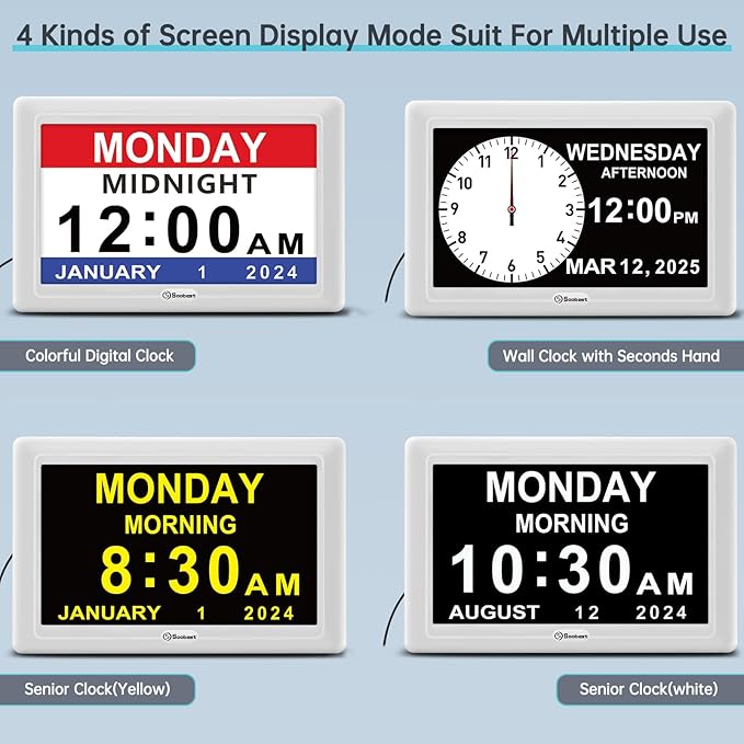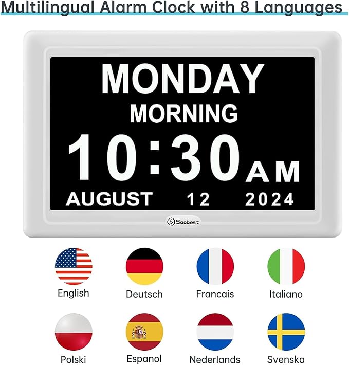 - ๐๐ฒ๐บ๐ฒ๐ป๐๐ถ๐ฎ ๐๐น๐ผ๐ฐ๐ธ ๐ญ๐ฎ ๐ฅ๐ฒ๐บ๐ถ๐ป๐ฑ๐ฒ๐ฟ๐ ๐ณ๐ผ๐ฟ ๐ฆ๐ฒ๐ป๐ถ๐ผ๐ฟ๐ ๐ ๐ฒ๐บ๐ผ๐ฟ๐ ๐๐ผ๐๐ - Soobest digital calendar day clock for senior has up to 12 sets of alarms, each alarm could be set as a reminder like a medicine reminder, meal reminder, shower reminder etc. When the alarm goes off, the clear colorful icon with specific words will also help your family member get rid of misunderstanding.