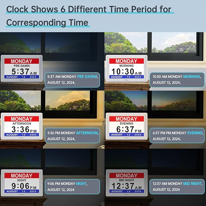 - ๐ฒ ๐ง๐ถ๐บ๐ฒ ๐ฃ๐ฒ๐ฟ๐ถ๐ผ๐ฑ ๐๐ถ๐๐ฝ๐น๐ฎ๐ - Soobest large digital clock for seniors could show 6 different time period at corresponding time on the HD screen: pre dawn, morning, afternoon, evening, night, mid night. For example, when the time comes to 6:00 AM, the time period will display morning on the screen in case of seniors taking it for 6:00 PM by mistake.