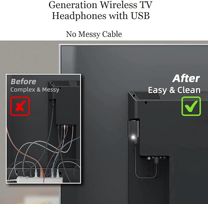 - Easy to Use - Connect the TV and transmitter via 3.5mm or RCA cable, USB transmitter plugs into 5V power supply or TV USB port for power, turn on the headset power pairing, no need for extra cables and power sockets, provides a neat look to your home TV wall .