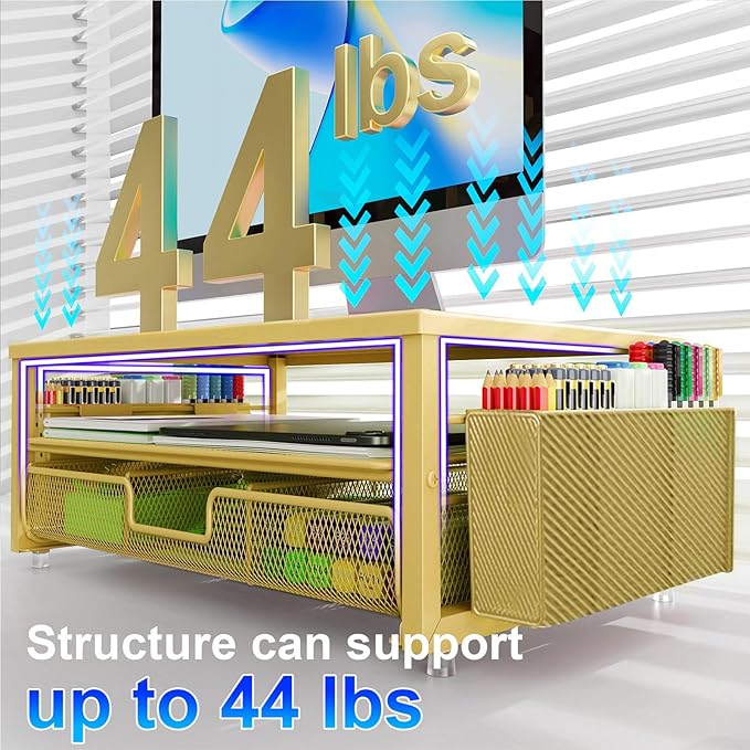 gianotter Desk Organizers and Accessories, Monitor Stand with Drawer and 2 Pen Holder, Desktop Organizer Suitable for Offices and Dormitories (Gold)
