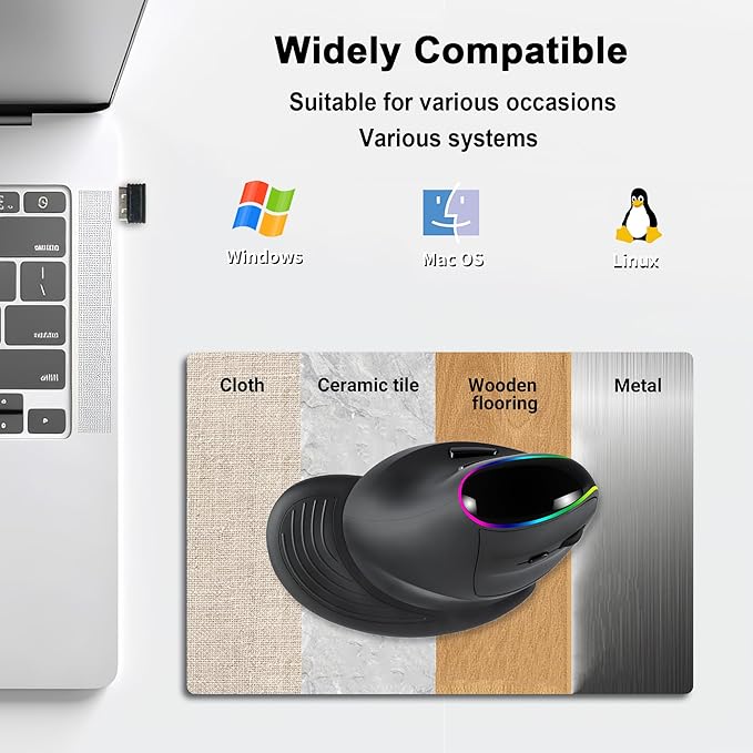 - Wide Compatibility - This wireless vertical mouse is compatible with most operating systems such as Windows 7/8/10/XP, Vista 7/8, Linux, Mac OS.This ergo mouse is perfect for desktops, laptops, PCs, ipad, tablet computer, Macbooks and other devices with USB ports and Bluetooth. (Note: the forward and back buttons are not available for Mac)