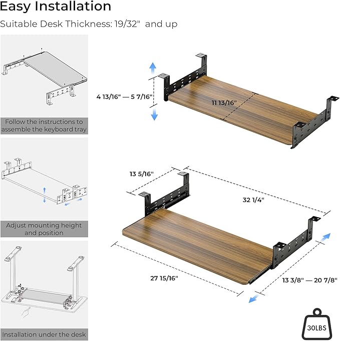 - 【Wide Compatibility】: This keyboard drawer is designed to be compatible with a wide range of desks, and is suitable for desktops made of materials such as wood, MDF, or other materials with similar characteristics (not compatible with plastic, hollow core panel, stone, glass, etc.). The keyboard shelf can be easily mounted under the desk for flexibility in adding desktop space. Note: The under-desk installation space should be 34"L x 15"W, with a minimum distance of 30" from the bottom of the tabletop to the floor. The desk should also be at least 0.59" thick. Please double-check the measurements and ensure there is enough legroom after installation before purchasing.