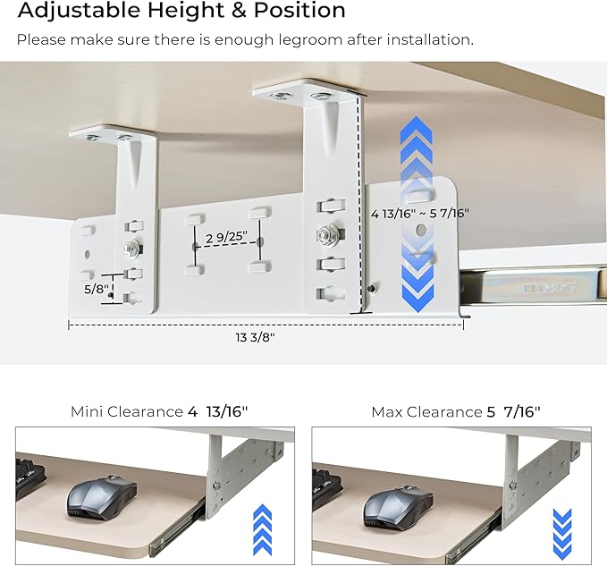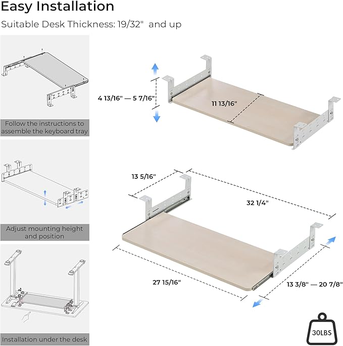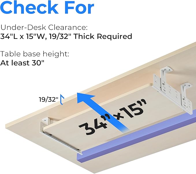 - 【Wide Compatibility】: This keyboard drawer is designed to be compatible with a wide range of desks, and is suitable for desktops made of materials such as wood, MDF, or other materials with similar characteristics (not compatible with plastic, hollow core panel, stone, glass, etc.). The keyboard shelf can be easily mounted under the desk for flexibility in adding desktop space. Note: The under-desk installation space should be 34"L x 15"W, with a minimum distance of 30" from the bottom of the tabletop to the floor. The desk should also be at least 0.59" thick. Please double-check the measurements and ensure there is enough legroom after installation before purchasing.