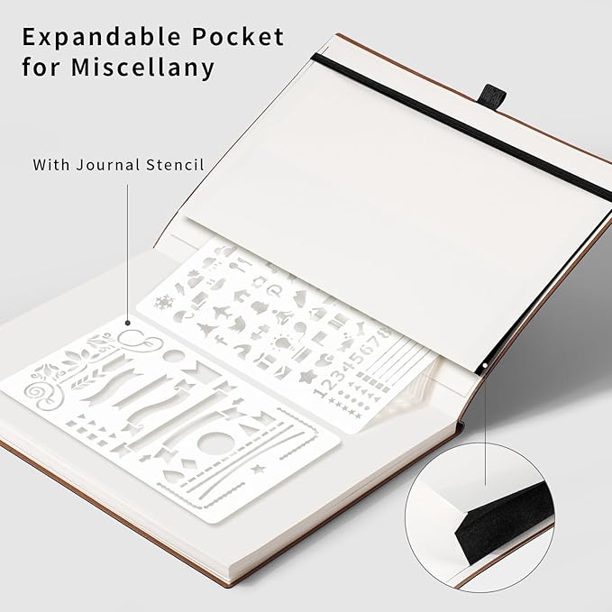 - CONVENIENT AND PRACTICAL LAYOUT: Features a pen holder for easy access to your pen, an elastic band to keep your notebook securely closed, 2 bookmarks for quick page referencing, an inner pocket for storing loose papers, and 2pcs journal stencils for additional creativity