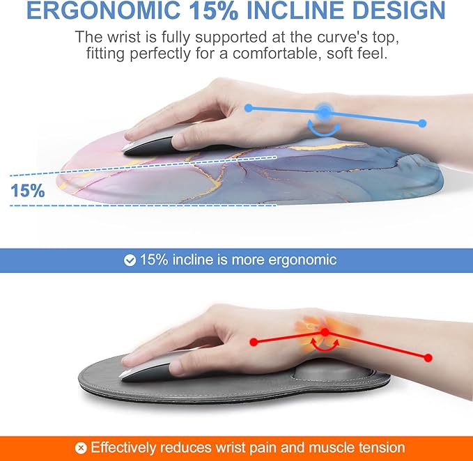 - 【Ergonomic Mouse Pad】This ergonomic mouse pad, featuring an incline of 8% in the front and 15% in the rear, is specially designed to keep your wrist in line with the keyboard and mouse. It provides comfortable support that reduces pain and fatigue from extended repetitive motion, helping to prevent carpal tunnel syndrome.